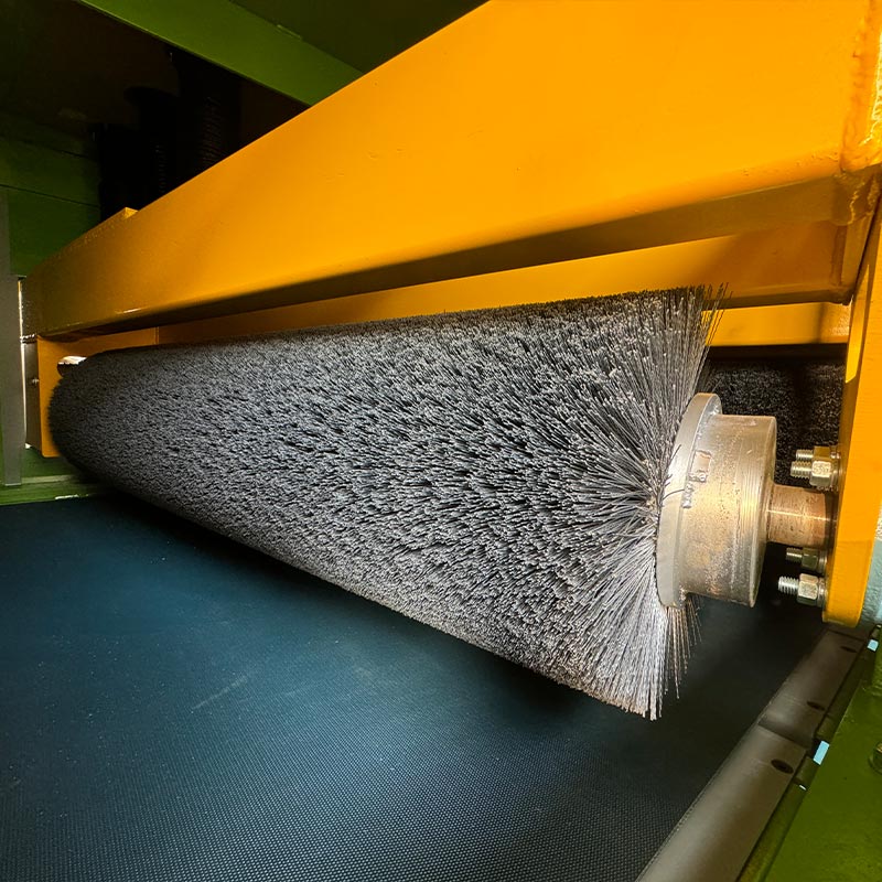 रबर ट्रैक कन्वेयर सिस्टम, जहां अपघर्षक ब्रश रोलर्स के 8 सेट क्रमिक रूप से रफ और फाइन को पूरा करते हैं